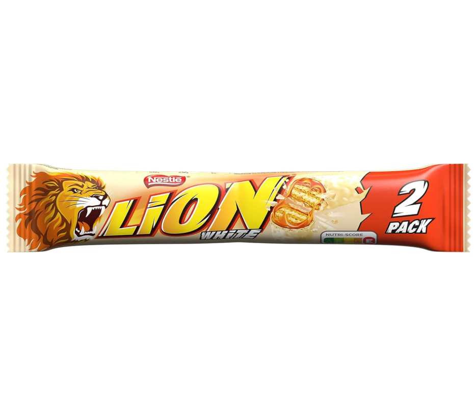 lionwhite 2 Pack 28x60g offers 28 twin bars of crispy cereal, caramel, and wafer coated in creamy white chocolate. A bold and crunchy treat with a smooth, sweet twist.